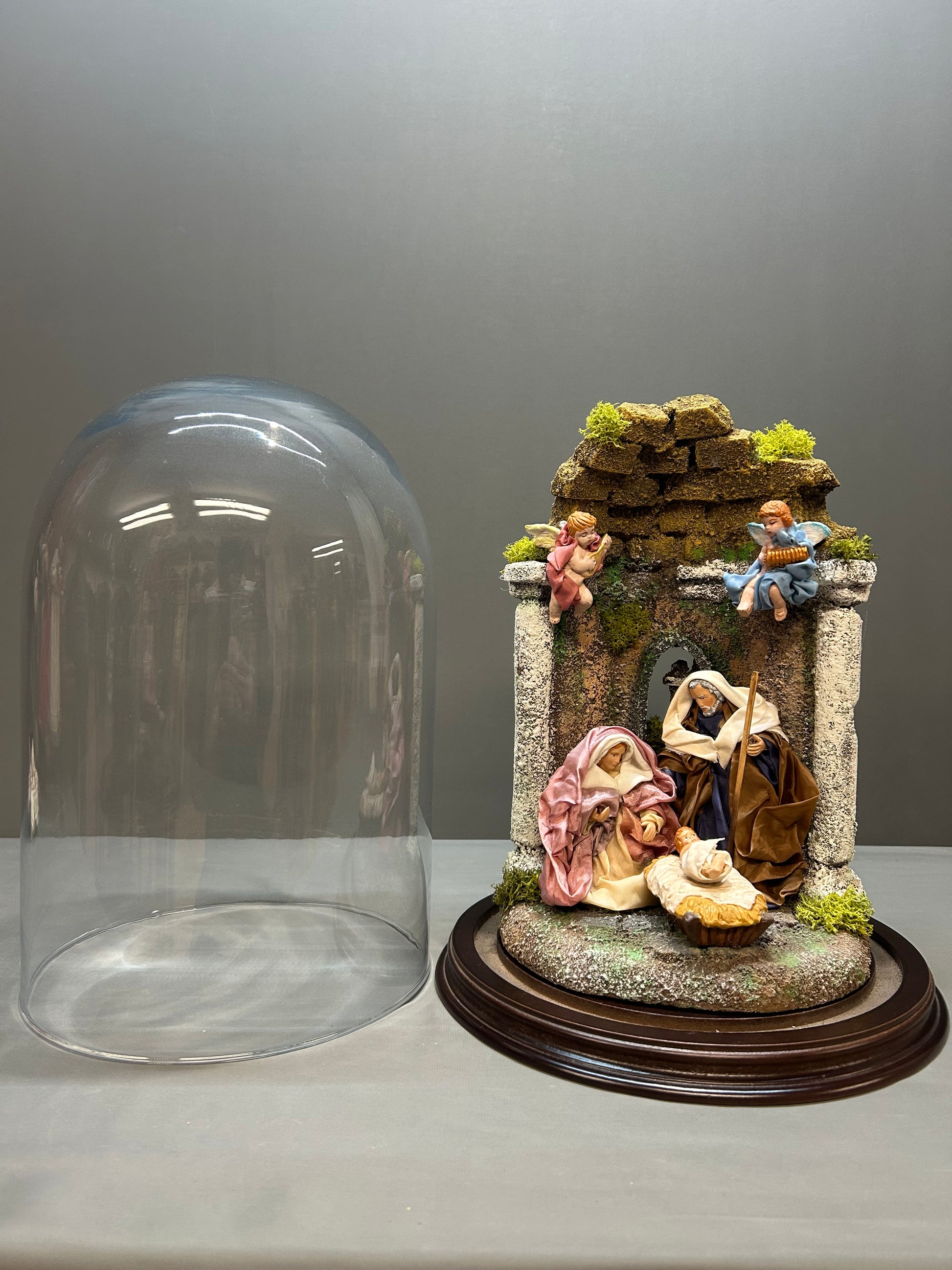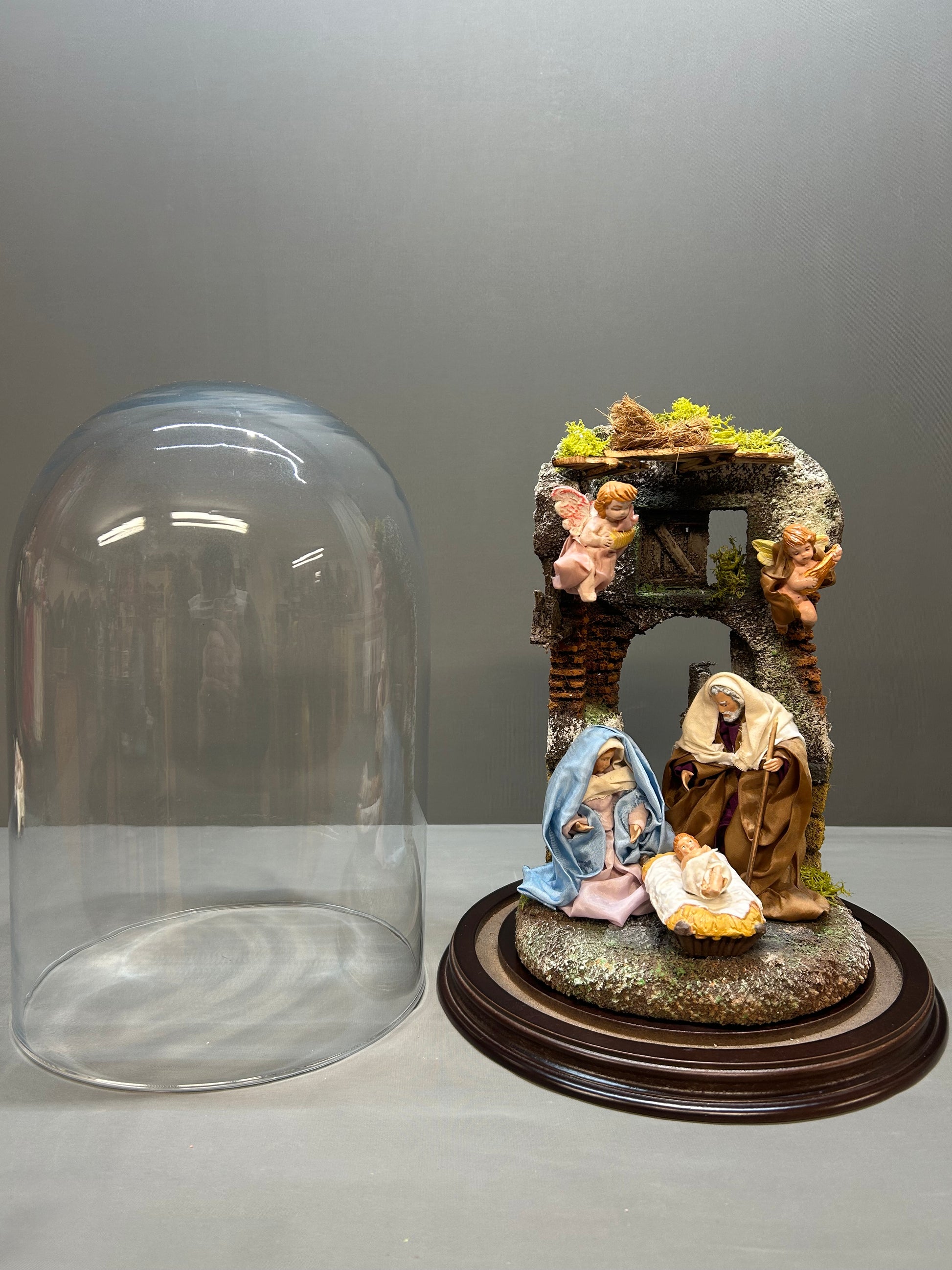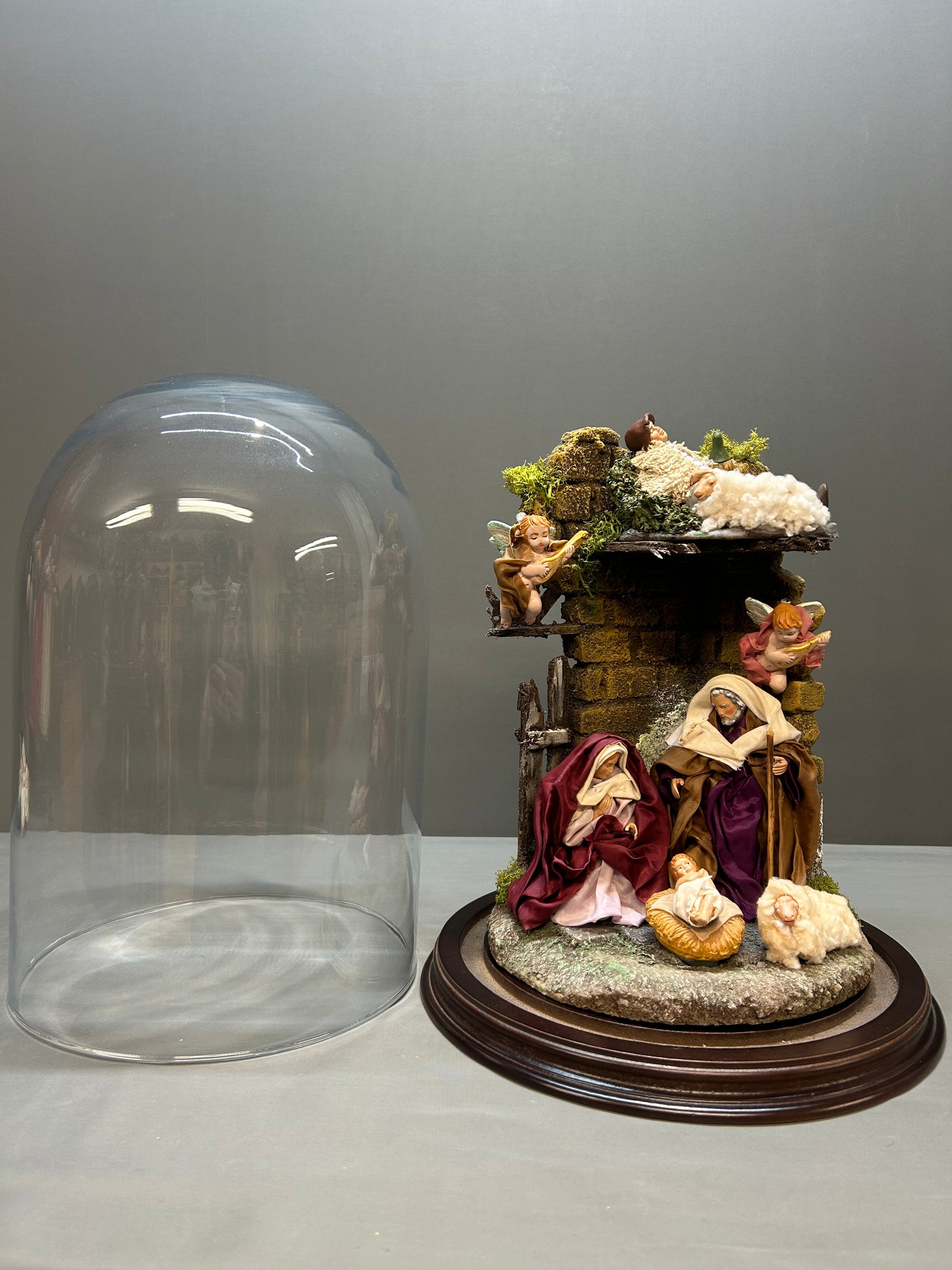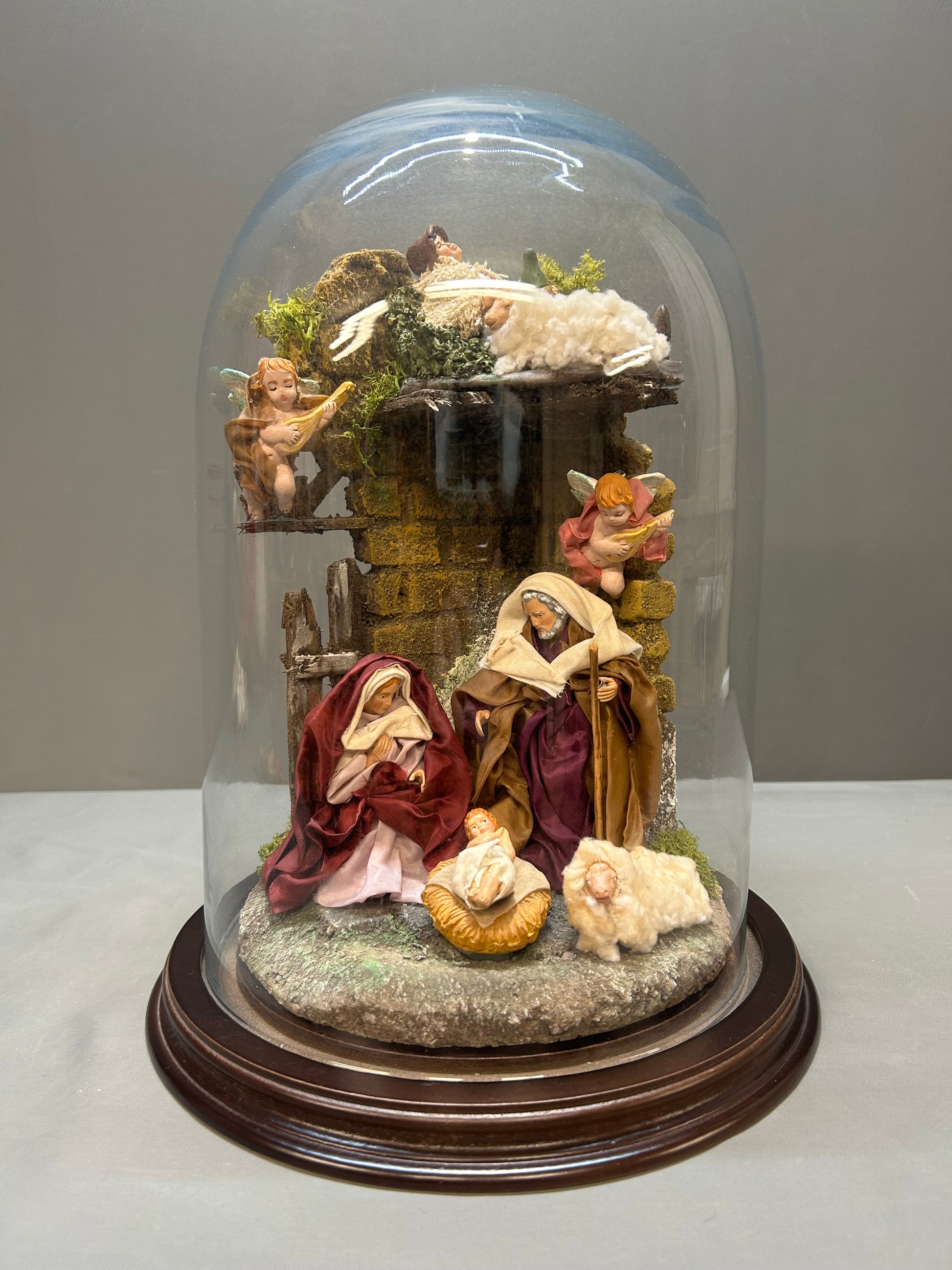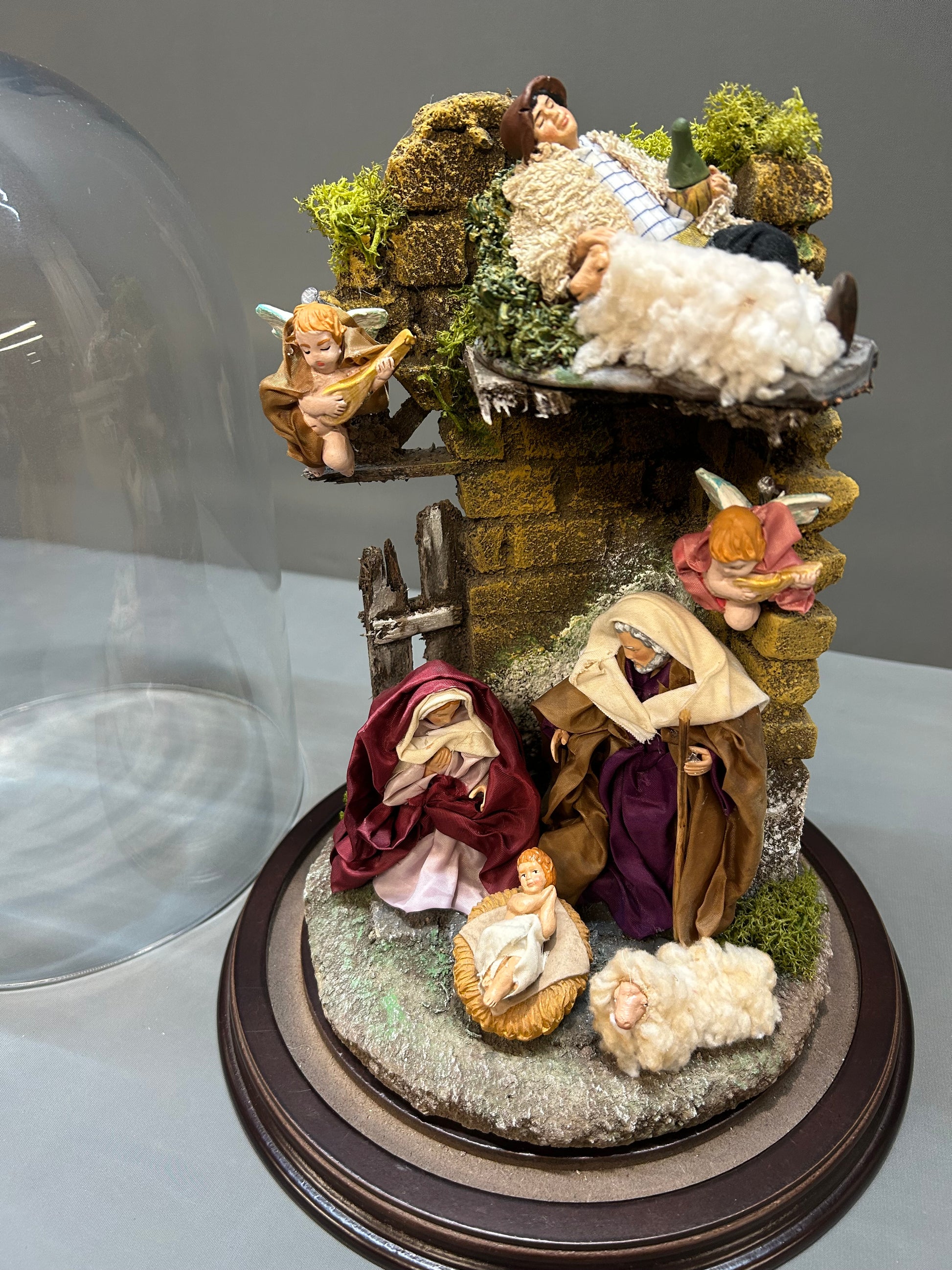Natività in campana di vetro, completa di statue, realizzata interamente a mano.