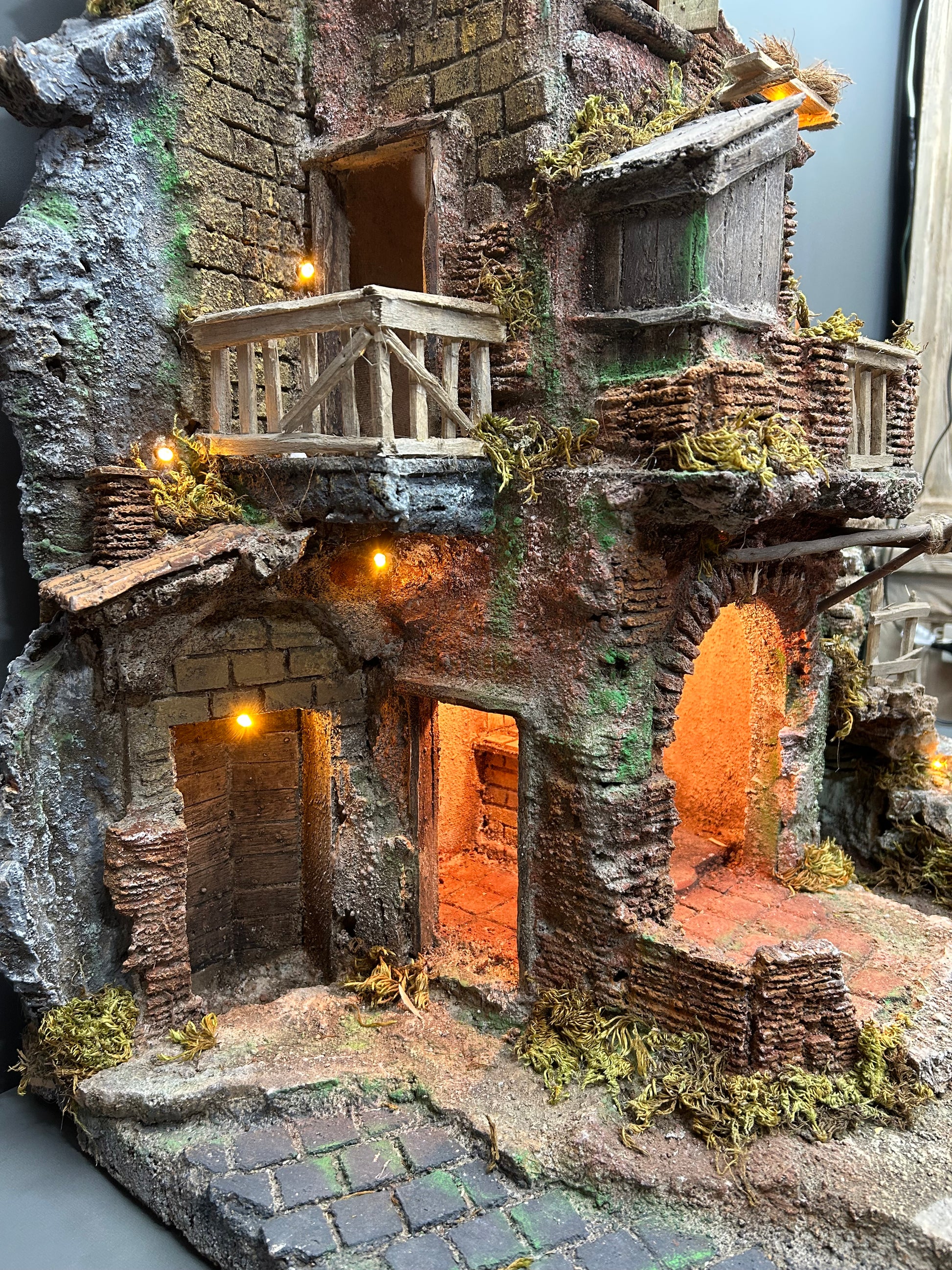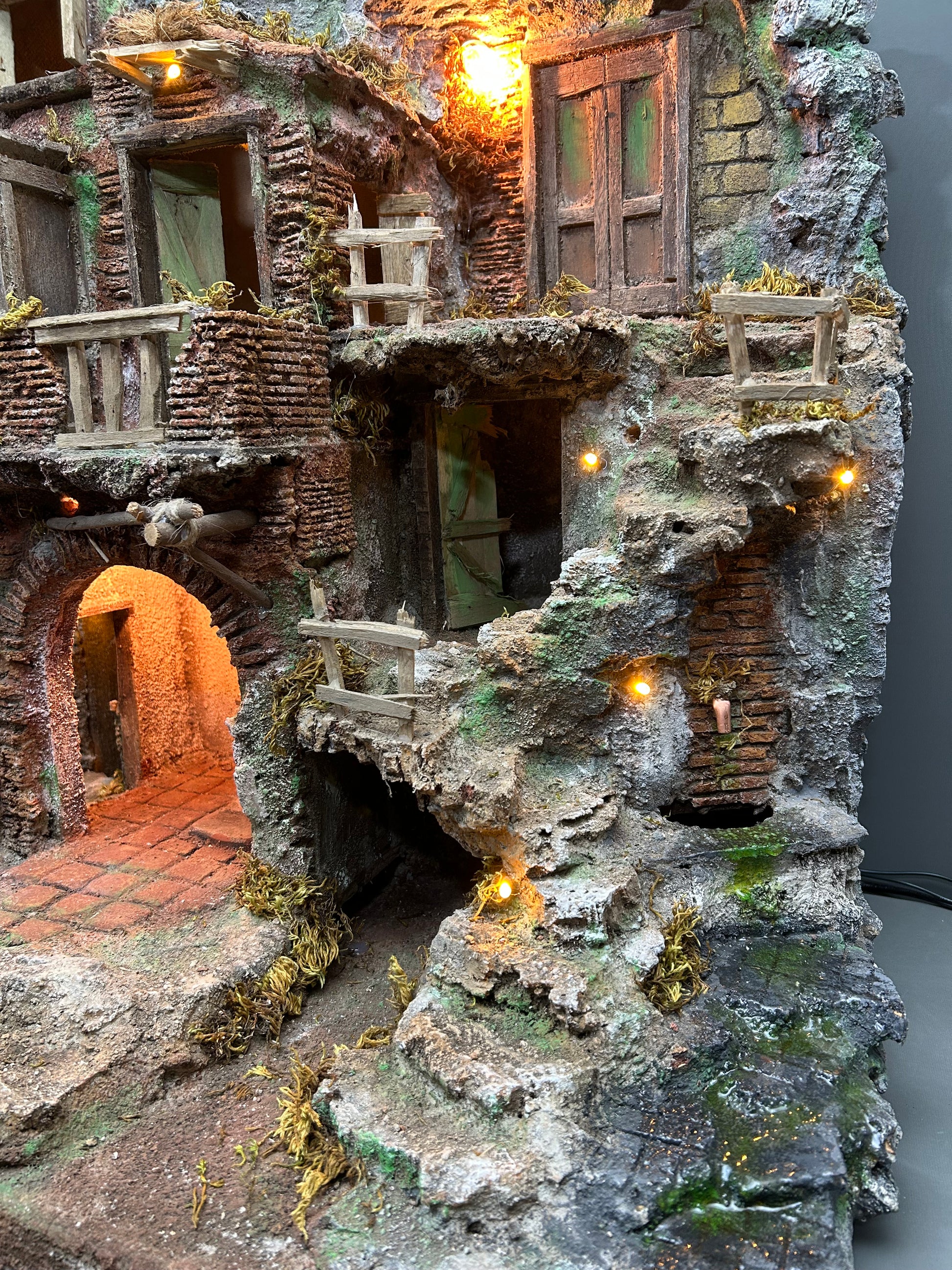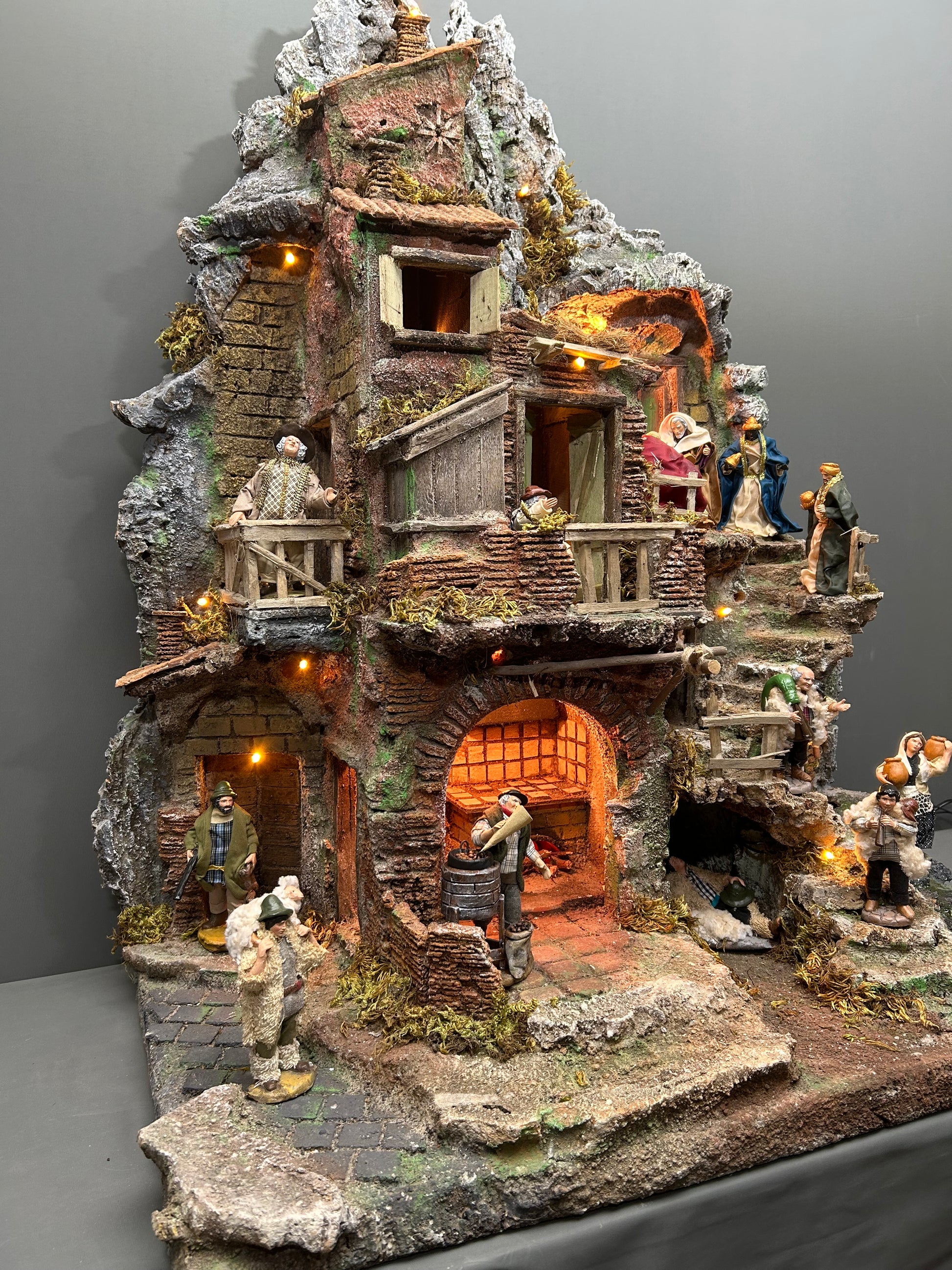Presepe realizzato completamente a mano secondo la tradizione del 700' napoletano. Completo di luci, fontana funzionante motorizzata, luce fuoco nell'osteria