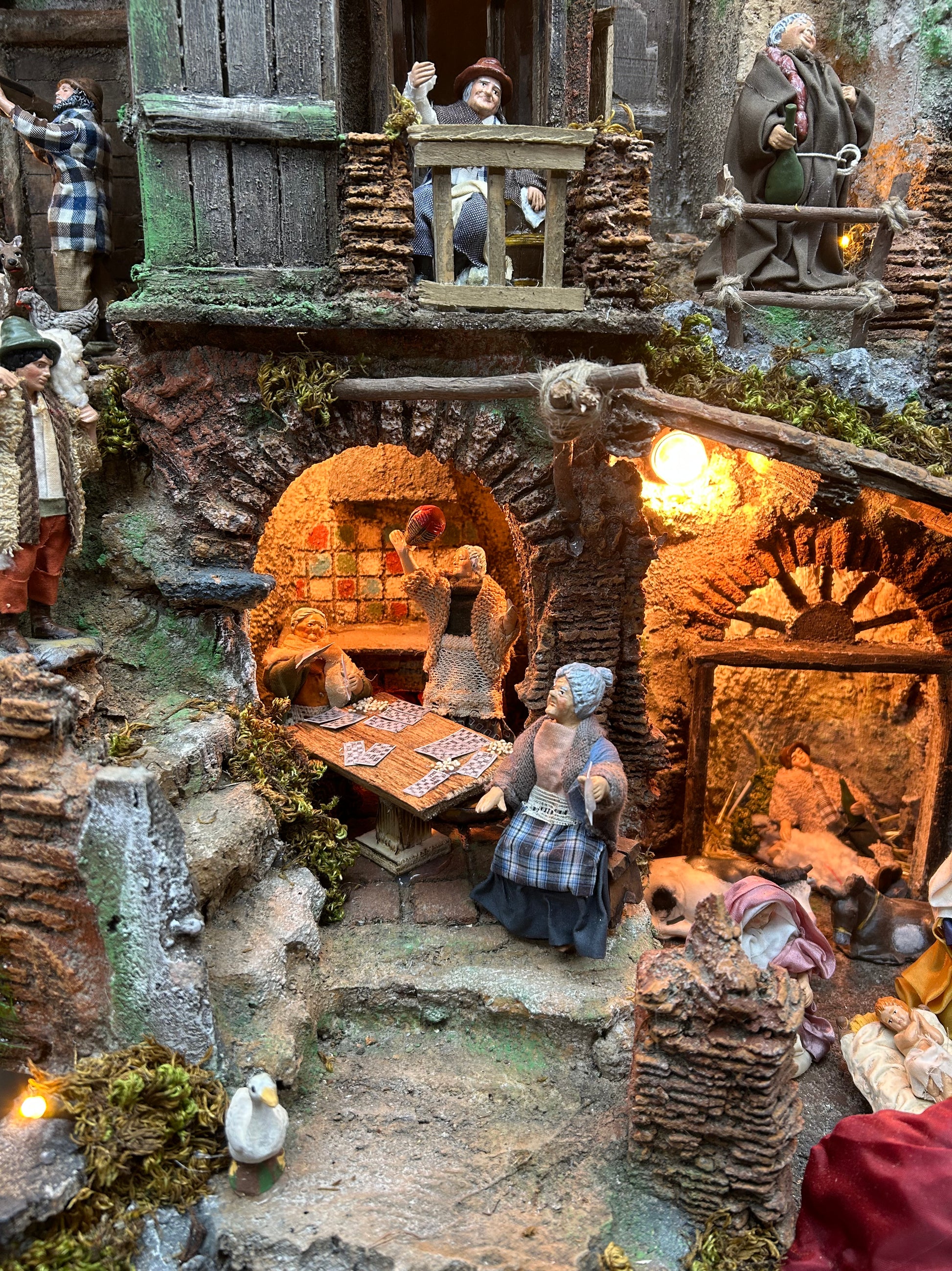 Struttura realizzata completamente a mano secondo la tradizione del 700' napoletano. Completo di luci, fontana funzionante motorizzata, mulino funzionante motorizzato, luce fuoco nell'osteria