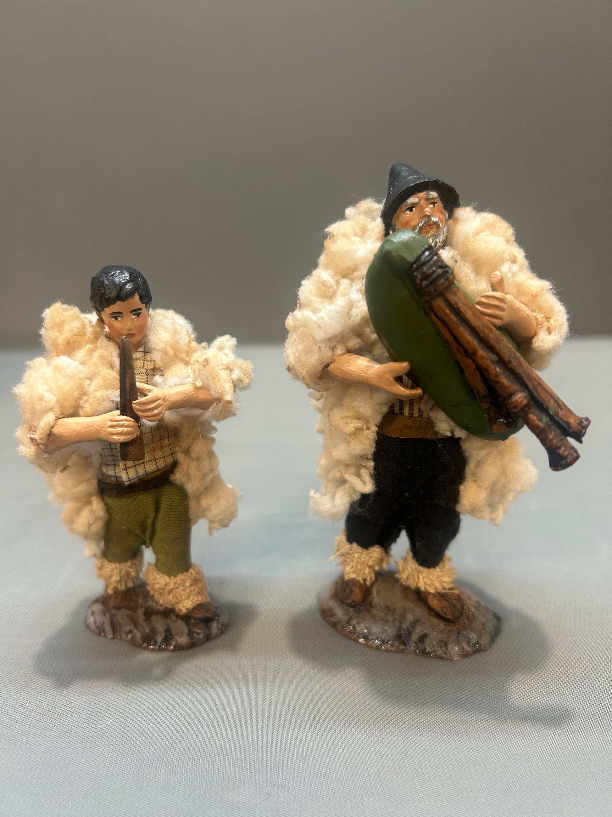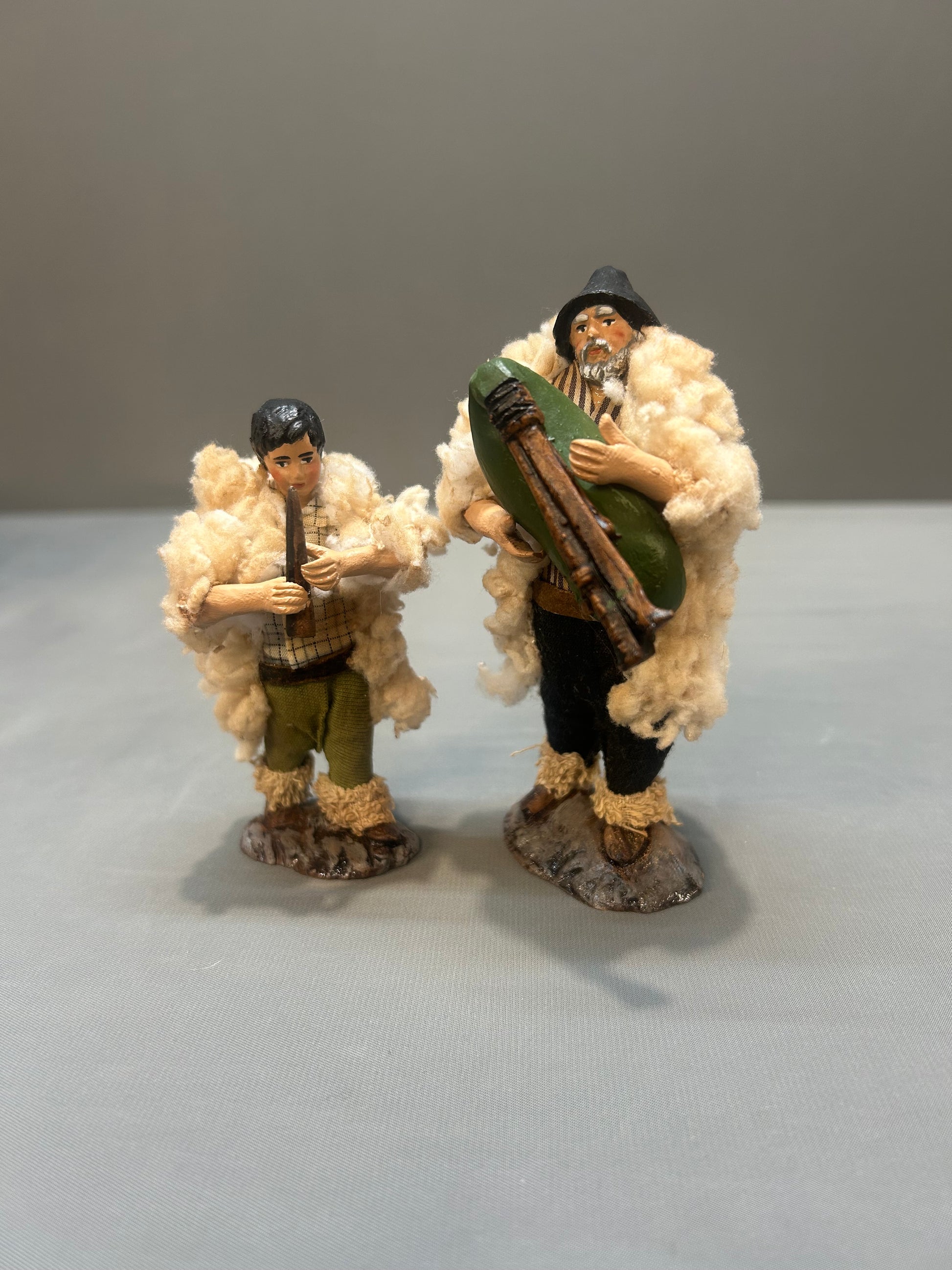 Coppia di Zampognari in terracotta realizzati interamente a mano, dipinti e vestiti con stoffe